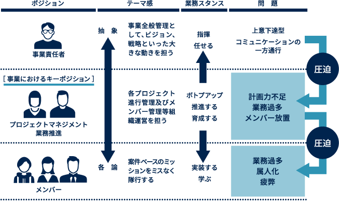 業務において「目的」「問題・課題定義」「計画性」「アウトプット」をそれぞれが意識して行動しないと、最終的にメンバーに負荷が掛かり、組織に閉塞感が発生しているケースが散見されます。その多くは「プロジェクトマネジメント」の質に問題があると考えます。